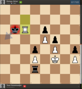 Wanneer tegenstander Teun Hanemaaijer Tc6+ zou hebben gespeeld moet Brian kiezen tussen of de koning verplaatsen en moeten dealen met uiteindelijk 2 verbonden vrijpionnen en een koning die uit positie is (nog steeds is dat theoretisch remise maar of Brian dat weet te keepen is een tweede) of de toren slaan en pat toestaan. Teun speelde echter Te7 en toen kon Brian de d pion pakken, de koning naar h2 dwingen en torens ruilen wat alsnog de overwinning opleverde. Oeffff!!
