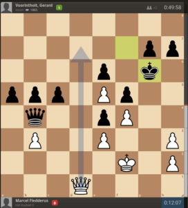 In deze stelling had Marcel Dd7 moeten spelen en dan heeft Gerard niks beters dan zetherhaling want na Kh5 Dxg7 dreigt Dxh7 en mat in 1. Dat heeft Marcel dan weer niet gezien maar 3 zetten later krijgt hij alsnog de kans op remise wat in 1e instantie werd gepakt maar toch weer werd weggeven en zo kon Gerard alsnog winnen. Na de ontsnapping tegen Valthermond opnieuw een ontsnapping voor Gerard.